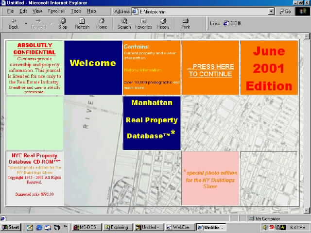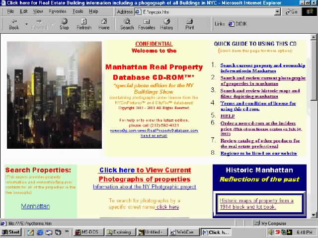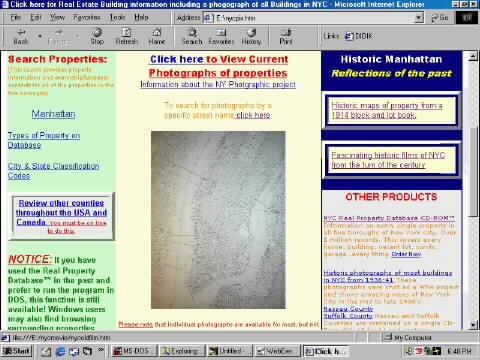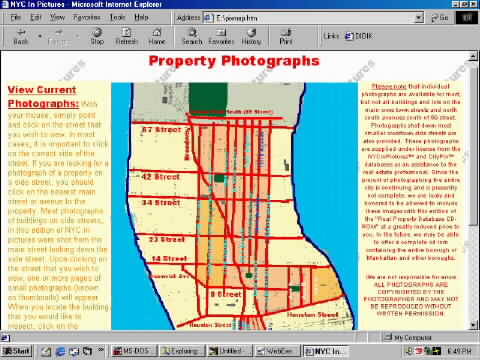 The Manhattan Picture Database CD-ROM is a project still being created. Currently, the cd contains over 10,000 photographs covering an estimated 31,000 properties in Manhattan. Coverage presently consists of buildings along the main avenues and on the primary cross towns streets up to 59 Street. Side streets and smaller streets has minimal coverage. The screenshot of the map (item 4 below) provides you with some idea of what is covered. In addition to the thousands of photographs, this remarkable cd-rom also contains a text database covering every single property in Manhattan. If that was not enough, the Manhattan Picture Database CD-Rom also contains historic information including a complete land/map block and lot book of Manhattan covering every property as it was in 1914. The cd also contains a number of "actuallities" or early movies of Manhattan which were shot between 1898 and 1905. This CD is truly fascinating.